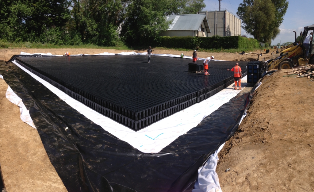 Date : 2021 Nom du chantier : PONT EVEQUE bassin enterré Type d’ouvrage: Rétention à la parcelle Description des travaux : Bassin enterré avec de multiples angles rentrants Projets associés